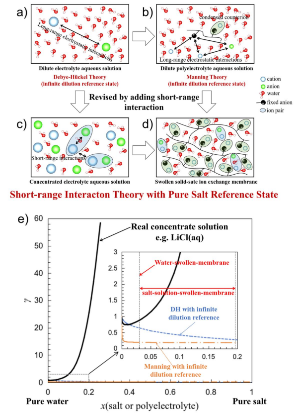 受Kenneth S. Pitzer濃電解質(zhì)溶液理論啟發(fā),研究人員認(rèn)為:離子交換膜的反離子凝聚效應(yīng)相較曼寧理論所描述的稀聚電解質(zhì)溶液要強(qiáng)的多;在純水溶脹的離子交換膜中,絕大多數(shù)的反離子處于凝聚狀態(tài),有效的屏蔽了聚合物鏈上的電荷。因此,自由離子之間的短程作用,而非長程靜電作用,才是決定性的。這點與忽略長程靜電作用的濃電解質(zhì)溶液理論完全一致。據(jù)此,研究人員創(chuàng)新性提出了"純水溶脹膜參考態(tài)"——首次明確區(qū)分了膜內(nèi)反離子與溶液相中反離子的標(biāo)準(zhǔn)化學(xué)勢。