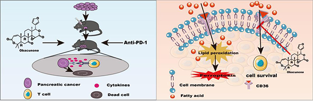 胰腺癌是一種惡性程度極高的消化系統(tǒng)腫瘤,五年生存率不足10%,目前缺乏有效的臨床治療措施,嚴(yán)重影響人類生命健康。近期,研究團(tuán)隊(duì)發(fā)現(xiàn)黃柏酮能顯著增強(qiáng)抗PD-1免疫療法治療胰腺癌的效果,增加腫瘤組織中免疫標(biāo)志物CD4+和CD8+T細(xì)胞的浸潤(rùn)而抑制腫瘤生長(zhǎng),蛋白質(zhì)組學(xué)分析發(fā)現(xiàn)黃柏酮主要通過調(diào)控CD36介導(dǎo)的PPAR信號(hào)通路,抑制胰腺癌PANC-1細(xì)胞CD36表達(dá),增加CD8+ T細(xì)胞數(shù)量,促進(jìn)胰腺癌細(xì)胞凋亡,從而抑制胰腺癌細(xì)胞生長(zhǎng)。相關(guān)研究成果發(fā)表在European Journal of Pharmacology(994 (2025) 177367)上。