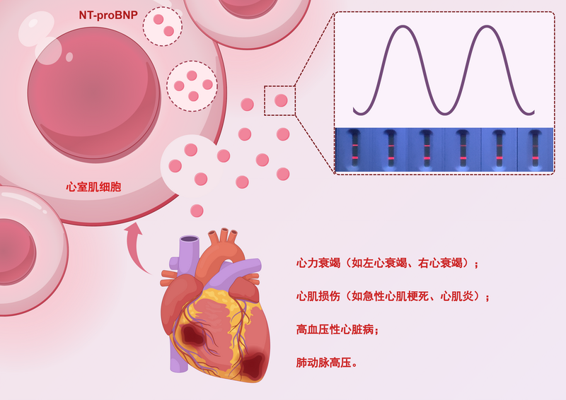 心臟在心力衰竭時,心肌細(xì)胞釋放NT-proBNP后被試劑盒通過時間分辨熒光系統(tǒng)檢出的示意圖