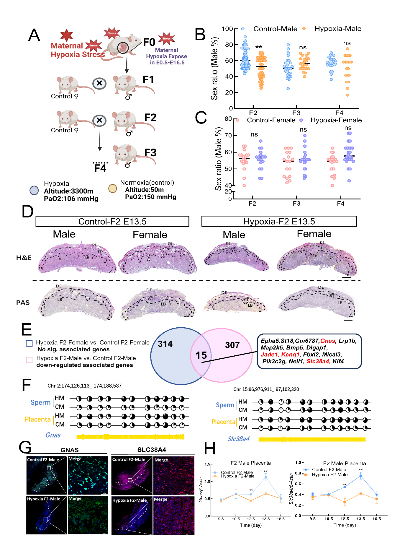 文章代表圖片A:低氧暴露及傳代實(shí)驗(yàn)?zāi)J綀D;B:F2-F4代雄性組胚胎出生性別比例統(tǒng)計(jì);C:F2-F4代雌性組胚胎出生性別比例統(tǒng)計(jì);D:H&E染色分析F2代E13.5不同性別小鼠胎盤形態(tài);EWGBS與轉(zhuǎn)錄組聯(lián)合分析篩選差異父源印記基因;F候選基因在F1精子和F2胎盤中甲基化位點(diǎn)的甲基化水平;G候選基因在E13.5胎盤中的蛋白表達(dá)免疫熒光染色;H候選基因在F9.5-E16.5胎盤中的基因表達(dá)變化趨勢。