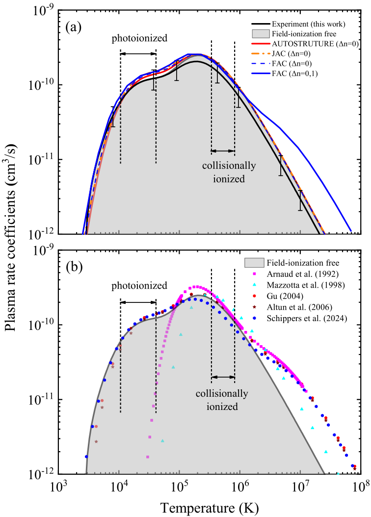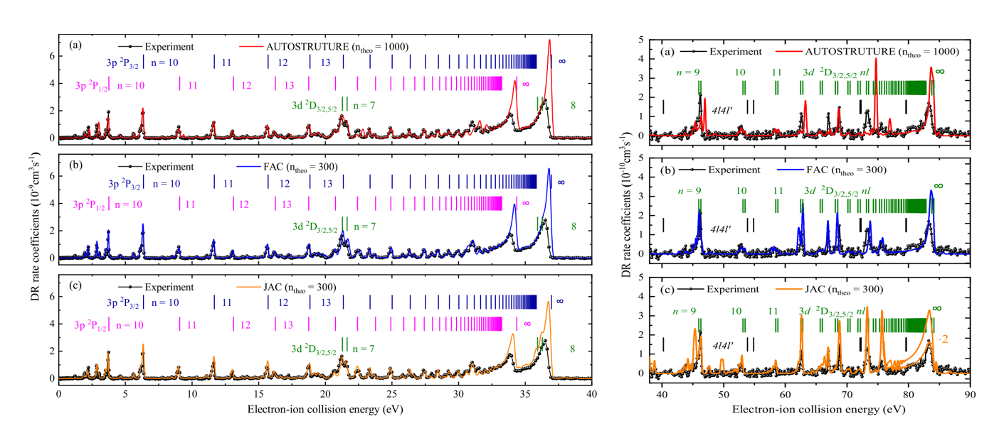 基于蘭州重離子加速器冷卻儲(chǔ)存環(huán)開展的高電荷態(tài)離子的雙電子復(fù)合精密譜學(xué)實(shí)驗(yàn)具有較高的能量分辨,且其電子-離子相對(duì)能量可大范圍精密調(diào)制,是目前唯一能夠精確測量低能碰撞復(fù)合截面關(guān)鍵數(shù)據(jù)的實(shí)驗(yàn)方法??蒲袌F(tuán)隊(duì)在對(duì)M殼層類鈉鐵離子 Fe15+的實(shí)驗(yàn)中,成功測量了 0-90 eV 能量范圍內(nèi)的復(fù)合速率系數(shù)。他們將實(shí)驗(yàn)結(jié)果與最新的理論Flexible Atomic Code (FAC) 、AUTOSTRUCTURE、Jena Atomic Calculator (JAC)計(jì)算的結(jié)果仔細(xì)對(duì)比,解析出每個(gè)共振結(jié)構(gòu)的來源。同時(shí),科研人員從雙電子復(fù)合速率系數(shù)得到了可用于等離子體建模的等離子體速率系數(shù),并與此前的理論數(shù)據(jù)作了對(duì)比研究。