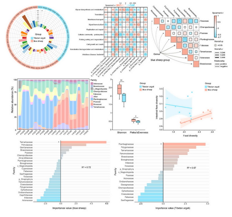中國科學(xué)院西北高原生物研究所動(dòng)物生態(tài)與資源保護(hù)研究團(tuán)隊(duì)在青海省昆侖山地區(qū)采集了西藏盤羊與巖羊的新鮮糞便樣本,結(jié)合宏基因組測序與植物 trnL片段的高通量測序技術(shù),深入分析了兩者腸道菌群組成、功能特征及食性結(jié)構(gòu)與腸道菌群在生態(tài)適應(yīng)與營養(yǎng)生態(tài)位分化中的潛在作用。研究發(fā)現(xiàn),西藏盤羊與巖羊共棲于高寒生態(tài)環(huán)境中,但其腸道菌群在組成結(jié)構(gòu)與功能特征方面表現(xiàn)出了顯著差異。食性多樣性的高低并不必然反映腸道菌群多樣性的水平,其中西藏盤羊雖食性相對(duì)單一,但其腸道菌群多樣性更高,具有更強(qiáng)的代謝適應(yīng)性與纖維降解能力;而巖羊擁有更廣泛的植物攝食譜,卻表現(xiàn)出在糖類代謝相關(guān)功能上更強(qiáng)的腸道菌群代謝適應(yīng)能力。綜合來看,腸道菌群與食性之間的協(xié)同作用可能在推動(dòng)兩物種營養(yǎng)生態(tài)位分化中發(fā)揮重要作用。此外,兩種動(dòng)物在抗生素耐藥基因組成上也存在差異,提示該類指標(biāo)在未來野生動(dòng)物健康評(píng)估中具有潛在應(yīng)用價(jià)值。本研究揭示了腸道菌群作為宿主環(huán)境適應(yīng)和生態(tài)位分化的重要調(diào)控因子,其與食性協(xié)同作用推動(dòng)了高原野生動(dòng)物的生態(tài)位分化。研究成果為理解大型食草動(dòng)物腸道菌群與環(huán)境適應(yīng)及生態(tài)位分化提供了全新視角,也為瀕危物種保護(hù)和高原生態(tài)系統(tǒng)可持續(xù)發(fā)展提供了重要參考。