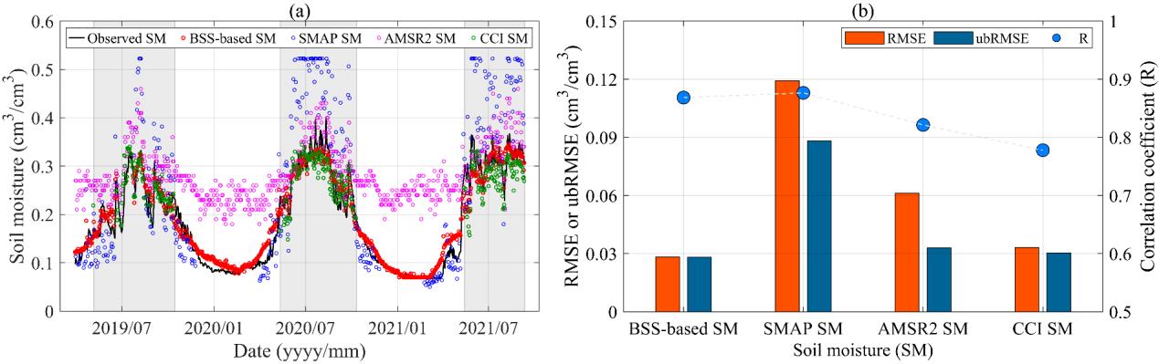 青藏高原典型觀測網(wǎng)絡實驗表明該方法具有良好的區(qū)域適用性及穩(wěn)定性,顯著降低了對地表粗糙度、植被等信息的依賴,僅利用亮溫時間序列自相關性約束與少量地面觀測信息,便可實現(xiàn)對土壤水分的高精度估算。該研究在理論機制與方法路徑上均實現(xiàn)了對傳統(tǒng)遙感反演范式的突破,為土壤水分遙感估算提供了一種無需構建微波輻射傳輸模型的新思路,同時也為多源信號混合環(huán)境下的其他要素估算提供了創(chuàng)新方案,具有重要的理論意義與應用推廣價值。