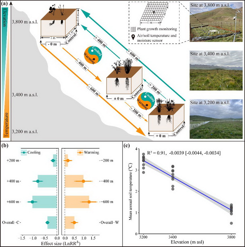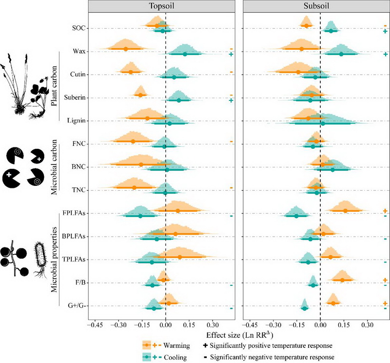 中國科學院西北高原生物研究所高寒生態(tài)系統(tǒng)與全球變化研究團隊依托2007年在青海海北高寒草地生態(tài)系統(tǒng)國家野外科學觀測研究站建立的“山體垂直帶雙向移栽實驗”平臺,基于生物標志物技術,并借助貝葉斯Meta統(tǒng)計分析在估計研究間異質(zhì)性和合并效應量方面的優(yōu)勢(尤其在納入研究數(shù)量較少時)、獨特的后驗分布估計、靈活的參數(shù)設置和便利的結(jié)果圖形化展示方法等特點,創(chuàng)新性地采用貝葉斯Meta分析方法分析控制實驗數(shù)據(jù),對多組處理、對照實驗進行了歸納性總結(jié),進而系統(tǒng)評估量化了增溫、降溫16年后高寒草甸表層(0-10 cm)和亞表層土壤(20-30 cm)有機碳含量的影響因素(包括植物生物量和多樣性、土壤理化性質(zhì)、植物源碳組分,微生物源碳組分以及微生物群落特性等)的變化及其與有機碳含量的關系。