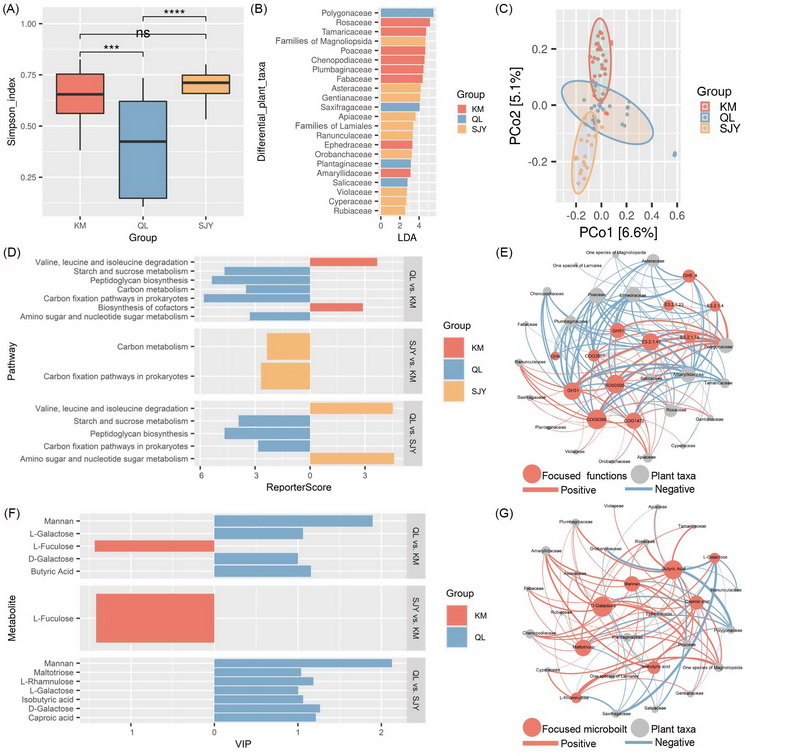 中國科學院西北高原生物研究所動物生態(tài)與資源保護研究團隊在青藏高原青海湖流域、昆侖山及三江源三大典型區(qū)域采集了巖羊的新鮮糞便樣本,利用trnL植物DNA條形碼技術、宏基因組測序技術和非靶向代謝組學技術,構建了巖羊食性 - 微生物 - 代謝物多組學關聯(lián)分析框架,深入解析了巖羊在青藏高原不同區(qū)域的食性差異、腸道微生物組成與功能特征及其代謝產(chǎn)物差異,探索了食性結構與微生物共生系統(tǒng)的協(xié)同變異規(guī)律,揭示了宿主 - 微生物共生系統(tǒng)在區(qū)域適應中的協(xié)同進化模式。