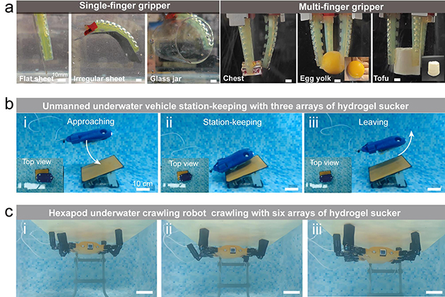 為進一步凸顯非破壞性粘附的實用性,研究人員研制了一款采用液壓驅(qū)動、配備仿生吸盤的水凝膠夾持器,可自適應(yīng)地操縱各種水下物體,不僅能應(yīng)對曲面復(fù)雜的物體,甚至還能溫和處理蛋黃、豆腐塊等極為脆弱的食品。 此外,研究人員將這類水凝膠吸盤陣列結(jié)構(gòu)集成到水下無人航行器的腹部和六足機器人的足端,從而賦予其水下操控物體、定點停留及表面爬行等特殊功能,為復(fù)雜海洋環(huán)境場景中的應(yīng)用提供了高適形、可逆、低損的粘附手段。
