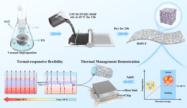 青海鹽湖所溶液結構與界面課題組研究團隊以三水醋酸鈉(SAT)作為相變材料,多孔膨脹石墨構建封裝空間,設計了一種無機相變薄膜。通過膨脹石墨在不同方向層間交聯(lián)形成3D多孔支撐骨架構建“熱橋”,實現(xiàn)熱量多維度傳遞。并且當電子器件臨界熱失控,相變薄膜主動儲存熱量,該“熱傳導+熱吸收”的雙重熱管理機制有效緩沖電子器件瞬時熱通量,且PVDF的引入使相變薄膜獲得熱誘導柔性、良好的阻燃與電絕緣性能。研究結果使熱失控電池模塊溫度降低10?℃,CPU表面溫度降低20?℃。