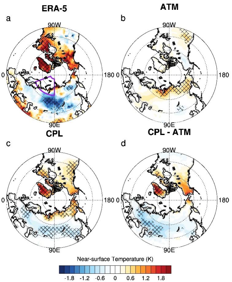 從ERA-5再分析資料(a)、僅考慮大氣過程的大氣模式試驗(yàn)(b)及包含海-氣耦合過程的全耦合模式試驗(yàn)(c)得到的歷史時(shí)期海冰消融導(dǎo)致的冬季地表氣溫異常(K)。(d)為全耦合模式試驗(yàn)與大氣模式試驗(yàn)結(jié)果之差