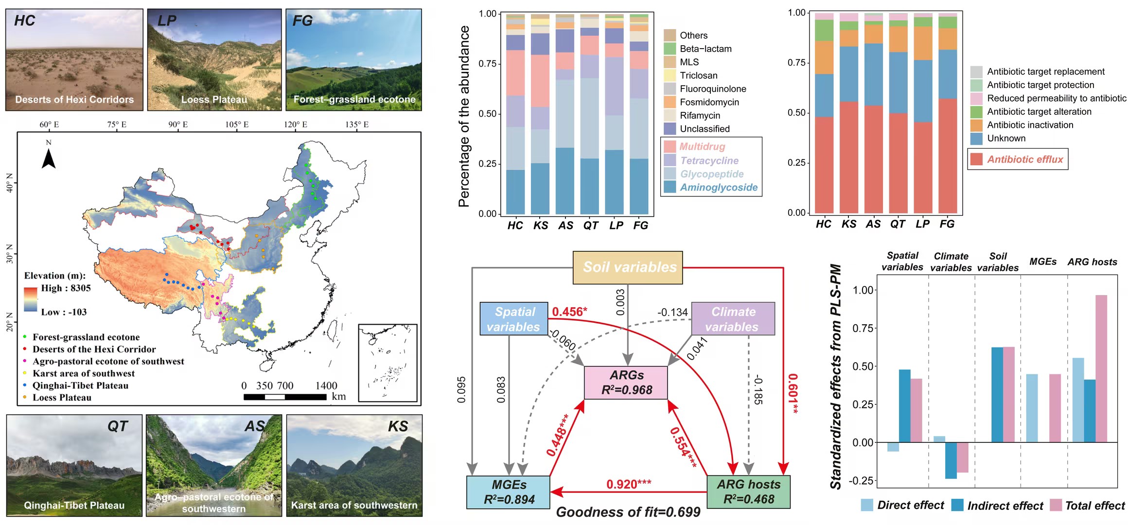 中國科學(xué)院西北生態(tài)環(huán)境資源研究院李玉強(qiáng)研究員團(tuán)隊(duì)在我國4300公里的范圍內(nèi),針對森林、草原、沙漠等六類典型陸地自然生態(tài)系統(tǒng),設(shè)立了42個(gè)采樣點(diǎn),運(yùn)用宏基因組學(xué)方法,系統(tǒng)揭示了表層土壤中ARGs的分布特征與傳播機(jī)制。