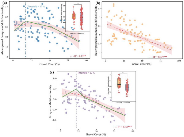 研究發(fā)現(xiàn),隨著礫石覆蓋度的增加,草地植物物種豐富度、功能群組成及生物量顯著下降,尤其是地下生物量的減少最為明顯;土壤含水量、孔隙度及養(yǎng)分含量顯著降低,而容重顯著升高,導(dǎo)致生態(tài)系統(tǒng)整體功能衰退。礫石化不僅直接抑制植物生長,還通過削弱土壤養(yǎng)分供給間接降低生態(tài)系統(tǒng)多功能性。隨機森林與結(jié)構(gòu)方程模型分析進一步揭示,土壤養(yǎng)分和植物多樣性是決定生態(tài)系統(tǒng)多功能性的關(guān)鍵調(diào)控因子。隨礫石化程度加劇,地上功能指數(shù)(AEMF)和地下功能指數(shù)(BEMF)均顯著下降,后者的響應(yīng)更為敏感,當?shù)[石覆蓋度超過22%時,生態(tài)系統(tǒng)多功能性(EMF)出現(xiàn)明顯突變性下降,表明該閾值可作為高寒草地退化的早期預(yù)警指標。研究指出,高寒草地礫石化退化過程會破壞植物-土壤耦合關(guān)系,導(dǎo)致生態(tài)功能的同步退化。
