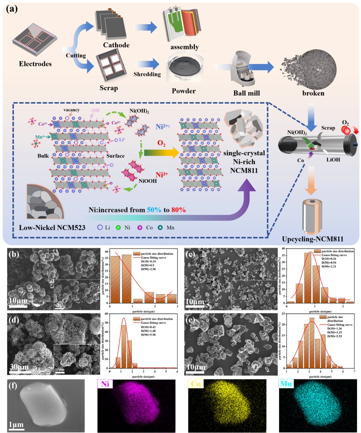 近日,中國科學(xué)院青海鹽湖研究所相變儲能課題組李翔副研究員提出一種針對低鎳、異質(zhì)三元正極混合廢料(如NCM523)的修復(fù)再生技術(shù),成功將其轉(zhuǎn)化為鎳梯度分布的單晶NCM811正極材料,實(shí)現(xiàn)了廢料的高值化利用與性能超越。該研究系統(tǒng)揭示了三元正極混合廢料在修復(fù)再生過程中的動態(tài)重構(gòu)路徑。研究發(fā)現(xiàn),由于混合廢料中不同尺寸顆粒在空氣中存儲時(shí)失效程度存在顯著差異,尤其是小粒徑顆粒更易受到空氣侵蝕,造成更深層次的晶格鋰損失和鹽巖相變,這為直接再生帶來巨大挑戰(zhàn)。團(tuán)隊(duì)創(chuàng)新性地采用“簡單機(jī)械球磨+雙過渡金屬補(bǔ)償”相結(jié)合的策略,無需嚴(yán)苛條件與原料均一性要求,即可將來源多樣、粒徑不一的NCM523混合廢料,修復(fù)再生為富鎳單晶NCM811正極材料。研究結(jié)果表明,該再生單晶NCM811材料展現(xiàn)出卓越的電化學(xué)性能:在0.1C倍率下比容量高達(dá)202 mAh/g;在1C倍率下循環(huán)200次后容量保持率達(dá)到80.7%,剩余容量超過145 mAh/g;即便在5C高倍率下循環(huán)200次,容量保持率仍保持在79.4%以上,其倍率性能與循環(huán)穩(wěn)定性優(yōu)于市售商用單晶NCM811材料。同時(shí),該材料有效抑制了H?→H?相變,進(jìn)一步提升了材料結(jié)構(gòu)穩(wěn)定性和電池安全性。