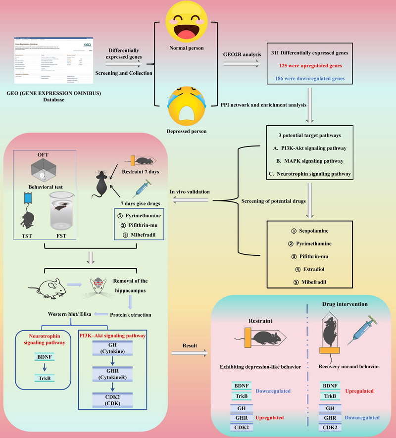 中國科學院西北高原生物研究所高原藏藥資源質(zhì)控與藥理毒理評價研究團隊以抑郁癥患者基因表達數(shù)據(jù)為基礎,先從GEO數(shù)據(jù)庫篩選出311個差異表達基因,經(jīng)加權(quán)基因共表達網(wǎng)絡分析、蛋白 - 蛋白相互作用網(wǎng)絡構(gòu)建及通路富集分析,發(fā)現(xiàn)這些基因主要富集于 PI3K-Akt、MAPK 和神經(jīng)營養(yǎng)因子三大與抑郁癥發(fā)病相關(guān)的信號通路;隨后利用第二代 CMAP 平臺,結(jié)合文獻調(diào)研篩選出3種候選小分子化合物(pyrimethamine,pifithrin-mu,mibefradil),通過分子對接實驗驗證,它們與上述通路關(guān)鍵蛋白(如 CDK2、TrkB 等)親和力高,部分滿足 “強結(jié)合” 標準(≤-7 kcal/mol);接著在慢性束縛應激小鼠模型中驗證 pyrimethamine,pifithrin-mu,mibefradil的抗抑郁效果,行為學測試(曠場試驗、強迫游泳試驗、懸尾試驗)顯示三者能顯著改善小鼠抑郁樣行為,效果與氟西汀相當;機制研究通過 Western blot 與 ELISA 實驗證實,三者可調(diào)控 PI3K-Akt 和神經(jīng)營養(yǎng)因子通路關(guān)鍵蛋白表達(降低 GH、GHR、CDK2 異常高表達,上調(diào) BDNF、TrkB 表達),Pearson 相關(guān)性分析驗證了通路調(diào)控與抗抑郁效果的直接關(guān)聯(lián),同時該研究還證實 “老藥新用” 策略在抗抑郁藥物研發(fā)中的高效性,并建立 “多數(shù)據(jù)庫整合 - 多組學分析 - 體內(nèi)外驗證” 的框架,成功挖掘出 3 種具有抗抑郁潛力的小分子化合物,為抑郁癥治療提供新候選藥物及作用機制參考。