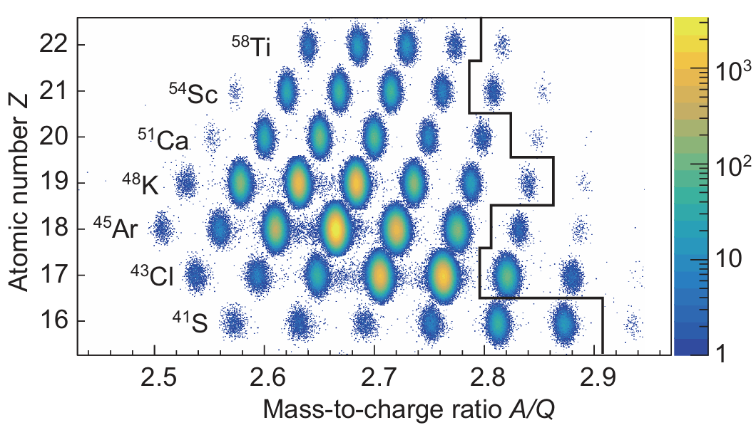 圖1:本次實(shí)驗(yàn)的原子核二維粒子鑒別圖。圖中黑色實(shí)線右側(cè)為本工作首次測量半衰期的原子核