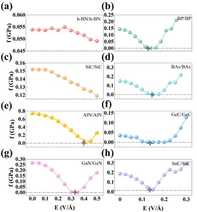 圖3. 8種類h-BN材料的摩擦力f與外電場E的關(guān)系。