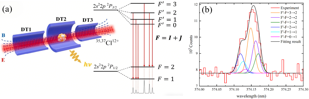 由于高電荷態(tài)離子制備條件苛刻、多電子體系能級結(jié)構(gòu)復(fù)雜,對其開展高精度實(shí)驗(yàn)測量長期面臨較大的技術(shù)挑戰(zhàn)。研究團(tuán)隊(duì)依托高溫超導(dǎo)電子束離子阱(EBIT)實(shí)驗(yàn)平臺,首次成功觀測到類硼氯離子(Cl12+) 中2P1/2和 2P3/2能級的超精細(xì)分裂結(jié)構(gòu),并通過高分辨譜線擬合獲得了相應(yīng)的超精細(xì)結(jié)構(gòu)常數(shù),利用第一性原理理論計(jì)算,成功提取該離子原子核的磁偶極和電四極超精細(xì)結(jié)構(gòu)常數(shù)。該工作為中等原子序數(shù)高電荷態(tài)離子超精細(xì)結(jié)構(gòu)的理論研究提供了重要實(shí)驗(yàn)基準(zhǔn)。