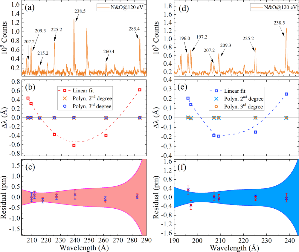 圖2. (a, d)分別為類鈹 S12+和Cl13+離子的校刻光譜;(b, d)分別為S12+和Cl13+離子的離子色散函數(shù)的殘差圖;(c, f) 為殘差放大圖和1-σ置信區(qū)間;