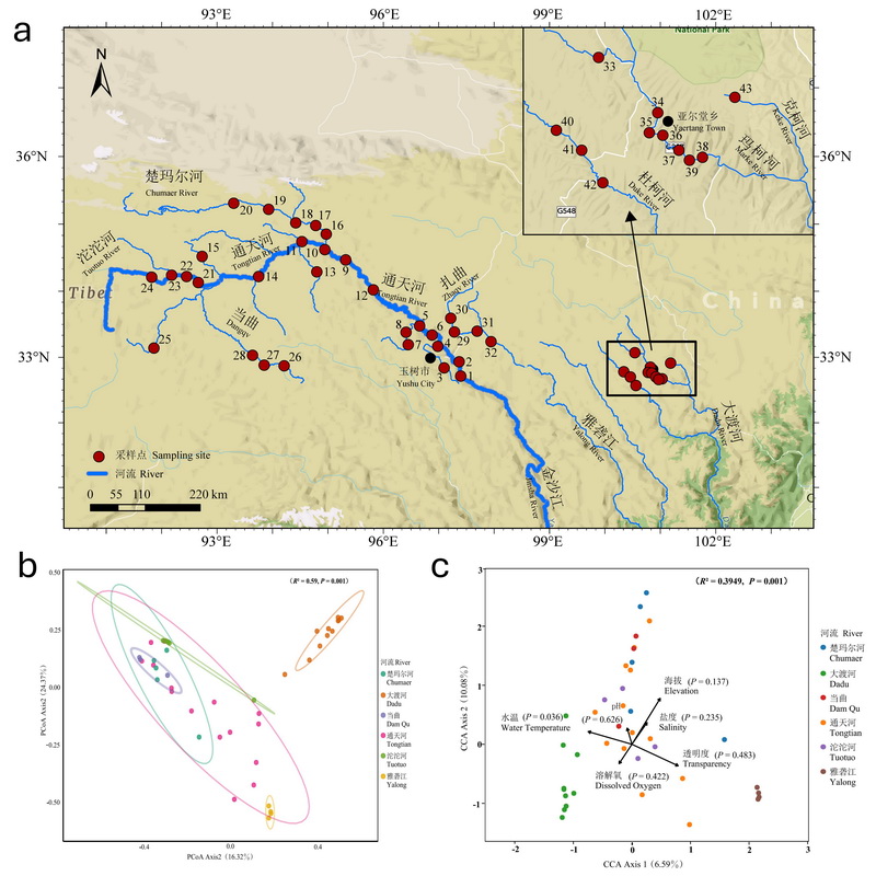 a 青藏高原長(zhǎng)江源區(qū)調(diào)查采樣點(diǎn)示意圖;b 長(zhǎng)江源區(qū)各水系魚類群落主坐標(biāo)分析圖;c 長(zhǎng)江源區(qū)各水系魚類群落典范對(duì)應(yīng)分析圖
