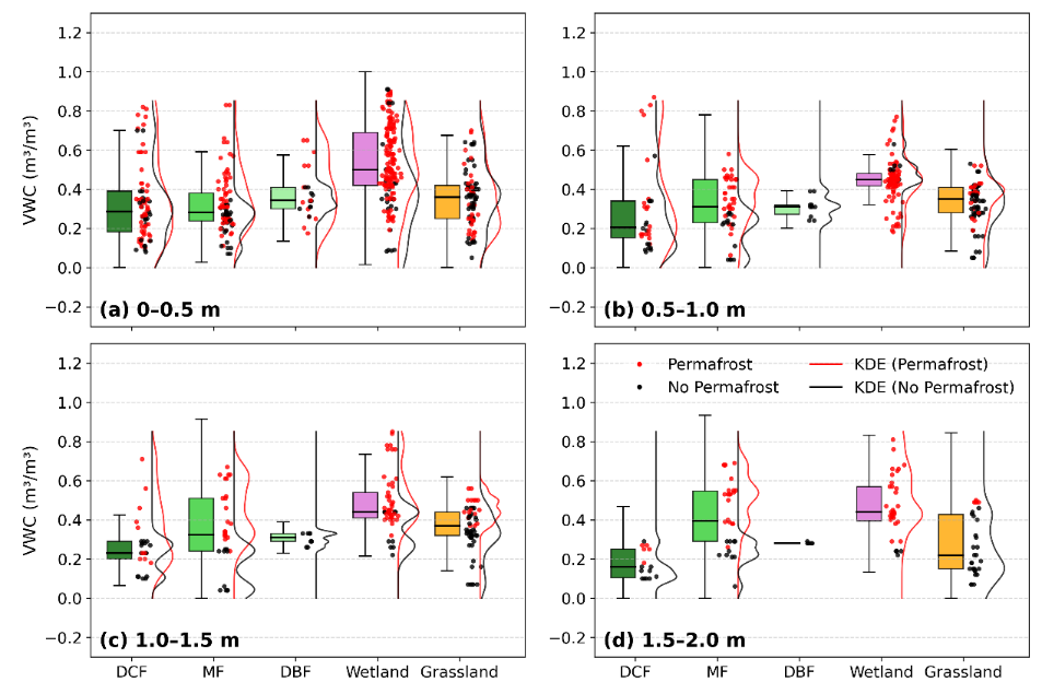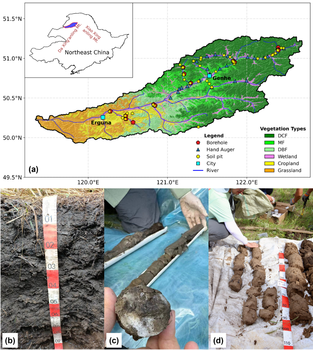 研究團(tuán)隊在根河流域布設(shè)75個淺層土壤剖面和15個深達(dá)20米的鉆孔,獲取了覆蓋森林、草地、濕地等不同下墊面的土壤含水量觀測數(shù)據(jù)。并結(jié)合可解釋機(jī)器學(xué)習(xí)與結(jié)構(gòu)方程模型,系統(tǒng)揭示了邊緣多年凍土區(qū)土壤水分的“垂向分層”特征及其控制機(jī)制。