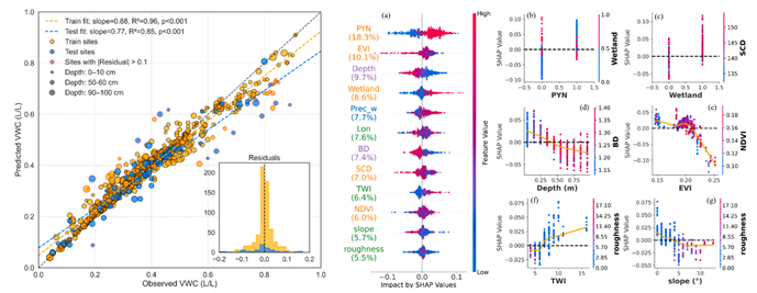 該數(shù)據(jù)產(chǎn)品表現(xiàn)優(yōu)異(R2 = 0.85, RMSE = 0.08 L/L),能精準(zhǔn)刻畫凍土與濕地共同塑造的“河谷濕潤走廊”及干燥高地的空間分異,彌補(bǔ)了SMAP等全球粗分辨率產(chǎn)品難以解析深層與亞公里尺度異質(zhì)性的不足,為寒區(qū)流域水文模擬與生態(tài)管理提供了可移植的制圖方案與高精度基礎(chǔ)數(shù)據(jù)。