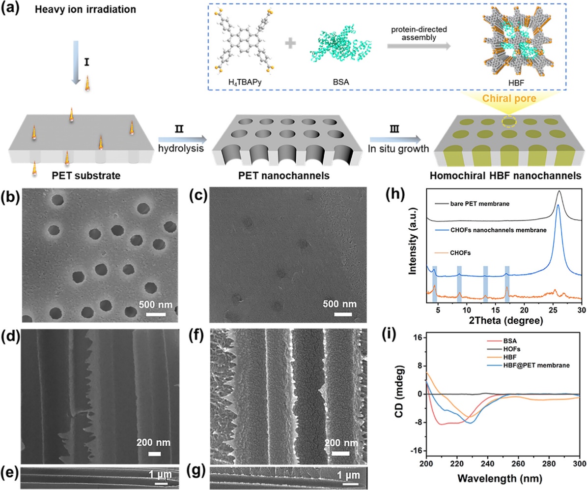 近日,中國科學院近代物理研究所重離子科學與技術全國重點實驗室材料研究中心與蘭州大學化學化工學院、東江實驗室合作,在手性分離膜研究方面取得重要進展。研究團隊依托蘭州重離子加速器(HIRFL)提供的重離子輻照技術,成功制備出一種具有同手性特征的氫鍵生物雜化框架核孔膜(HBF@PET),實現(xiàn)了對氨基酸對映體的高效、精準分離。相關成果于近日發(fā)表在國際化學期刊《美國化學會志》(Journal of the American Chemical Society)上。