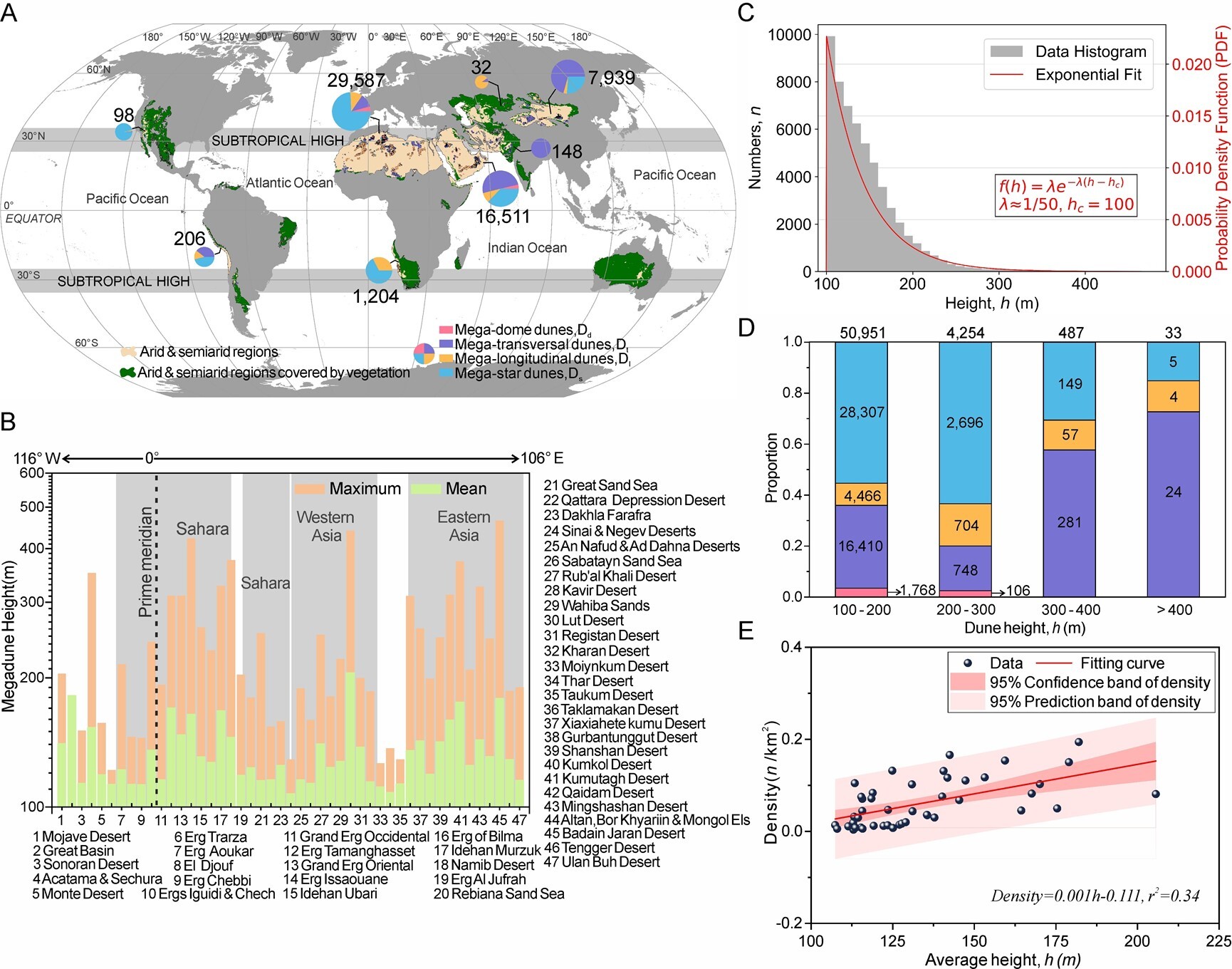 研究發(fā)現(xiàn),全球97%以上高大沙山集中于撒哈拉沙漠與亞洲干旱區(qū),充足沙源與強(qiáng)勁風(fēng)力是沙山發(fā)育的基礎(chǔ)條件;澳大利亞沙漠因植被覆蓋度高、輸沙量有限,而未發(fā)育沙山。全球近91%的沙山高度介于100–200米,且以星狀沙山為主,表明多向風(fēng)況更利于沙山的形成;高度超300米后以橫向沙山為主,超過400米的沙山僅有33座??臻g上,大陸內(nèi)部沙丘場沙山平均高度更高且沙山密度隨沙山平均高度升高而顯著增加。