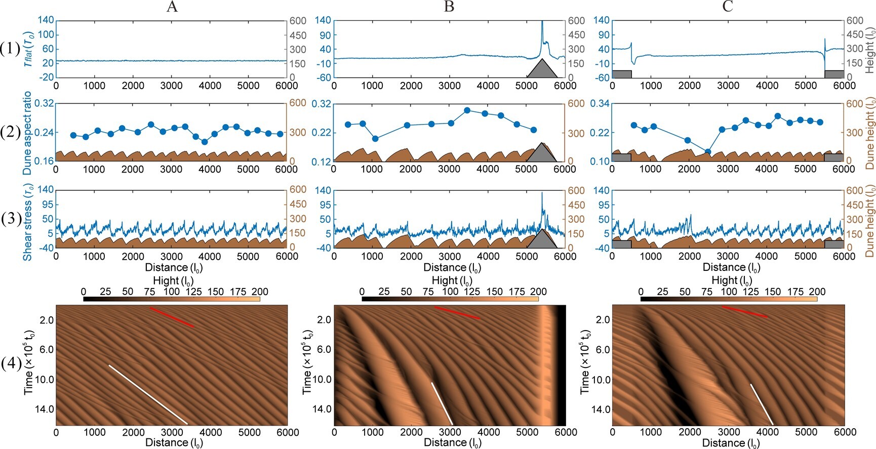 數(shù)值模擬結(jié)果揭示了沙山發(fā)育的核心機(jī)制:平坦地形下沙物質(zhì)均勻分配,抑制高大沙山發(fā)育;山體、盆地等正負(fù)地形引發(fā)剪切應(yīng)力突變,增強(qiáng)沙通量匯聚與沙丘碰撞融合,加速沙丘“粗化”長高。地形通過持續(xù)塑造風(fēng)場與沙源空間異質(zhì)性,成為高大沙山形成的關(guān)鍵動力。