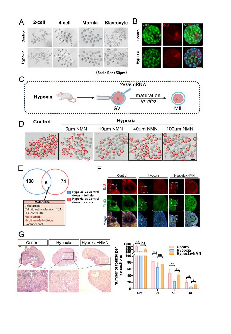 文章代表圖:(A)對照組與低氧組 2-細(xì)胞、4 -細(xì)胞、桑椹胚及囊胚期小鼠胚胎代表圖片(標(biāo)尺:50 μm)。(B)對照組與低氧組囊胚中滋養(yǎng)層細(xì)胞標(biāo)記物 Cdx2(綠色)、內(nèi)細(xì)胞團(tuán)標(biāo)記物 Oct4(紅色)及核標(biāo)記 DAPI(藍(lán)色)的免疫熒光共定位結(jié)果。(3)Sirt3 mRNA顯微注射低氧GV 期卵母細(xì)胞,進(jìn)行Sirt3過表達(dá)實(shí)驗(yàn)。 (D) 對照組及低氧組卵母細(xì)胞在不同濃度 NMN 體外處理后的成熟情況對比(紅色圈標(biāo)記成熟卵母細(xì)胞,標(biāo)尺:50 μm)。(E)低氧組與對照組卵泡液及血清中差異代謝物的交集分析,下方列出 6 個(gè)核心重疊差異代謝物。(F)對照組、低氧組及低氧 + NMN 組卵巢組織中增殖標(biāo)記物 EdU(紅色)、顆粒細(xì)胞分化標(biāo)記物 Foxl2(綠色)及 Merge 圖的免疫熒光結(jié)果(白色虛線框?yàn)榫植糠糯髤^(qū)域,標(biāo)尺:200 μm)。(G) 卵巢組織形態(tài)學(xué)分析與卵泡計(jì)數(shù):對照組、低氧組及低氧 + NMN 組卵巢組織 H&E 染色結(jié)果(左圖,標(biāo)尺為400 μm);各組原始卵泡(PmF)、初級卵泡(PF)、次級卵泡(SF)及有腔卵泡(AF)在 5 張連續(xù)切片中的數(shù)量統(tǒng)計(jì)(右圖)。