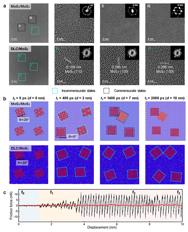 超潤(rùn)滑工程尺度實(shí)現(xiàn)面臨三大核心挑戰(zhàn),即大尺度接觸面的隨機(jī)無(wú)序性導(dǎo)致超潤(rùn)滑失控、高接觸壓力下界面形變導(dǎo)致超潤(rùn)滑失效、大氣環(huán)境活性氣氛引發(fā)界面摩擦化學(xué)反應(yīng)導(dǎo)致超潤(rùn)滑失穩(wěn)。針對(duì)上述挑戰(zhàn),研究團(tuán)隊(duì)從“宏觀接觸-微納界面-分子構(gòu)型-原子晶格”跨尺度結(jié)構(gòu)進(jìn)行逐級(jí)設(shè)計(jì)。首先,基于歸一化接觸思想,通過(guò)激光織構(gòu)構(gòu)建規(guī)則的接觸陣列,將宏觀面接觸歸一化為無(wú)數(shù)等同的微米級(jí)單元接觸,使每個(gè)單元的接觸狀態(tài)(面積、形狀、 受力等)保持一致,這樣界面潤(rùn)滑材料在同一接觸狀態(tài)下結(jié)構(gòu)變化也趨于一致,整體變得可控(圖1);其次,在每個(gè)接觸單元表面構(gòu)筑剛性非晶類金剛石碳(DLC)膜層/柔性晶體MoS2配副滑移元界面,剛?cè)峤Y(jié)合有力削弱接觸界面在極端高接觸壓力下的形變;進(jìn)一步采用MXene作為增強(qiáng)與錨定劑,使晶體MoS2在極端高接觸壓力和大氣環(huán)境下保持完整的層狀結(jié)構(gòu),減少了缺陷與邊緣的不利影響,賦予其抵抗水分子和氧氣氧化能力,從而維持超潤(rùn)滑界面的穩(wěn)定。最后,揭示了運(yùn)動(dòng)過(guò)程中原子晶格匹配的動(dòng)態(tài)偏轉(zhuǎn)微觀機(jī)制(圖2),即非公度態(tài)向公度態(tài)轉(zhuǎn)化,發(fā)現(xiàn)了非晶DLC/晶體MoS2永久非公度接觸特性,從根本上消除了晶格匹配所導(dǎo)致的原子互鎖。