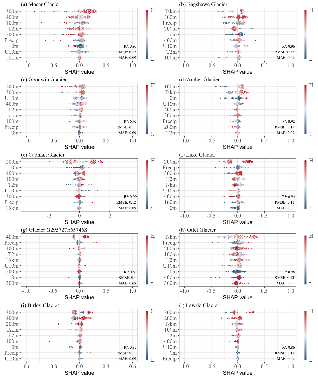 通過XGBoost 與 SHAP 模型分析不同驅(qū)動(dòng)因子對(duì)冰川流速的影響。0-400 m 代表不同深度的海洋溫度;Precip 表示冰川表面降水量;T2m 表示 2 米氣溫;U10m 表示 10 米風(fēng)速;Tskin 表示冰川表面溫度。