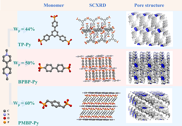 釷作為一種天然存在的放射性金屬,被譽(yù)為第四代核能系統(tǒng)的理想燃料。然而,其常與稀土元素伴生于獨(dú)居石等礦物中,分離極具挑戰(zhàn)。研究人員受自然界中富含釷的獨(dú)居石(磷酸鹽礦物)啟發(fā),采用含有蒽環(huán)的吡啶陽離子配體與二膦酸陰離子配體自組裝合成了膦酸功能化離子有機(jī)單晶(圖1,入選期刊內(nèi)封面)。研究表明,該材料對(duì)水溶液中Th(IV)的飽和吸附容量可達(dá)456mg/g,在多金屬共存、甚至真實(shí)海水體系中仍可保持極高的選擇性和穩(wěn)定性,研究成果發(fā)表在Nano Letters(2025, 25, 7665)上。進(jìn)一步通過調(diào)控膦酸基數(shù)量和苯環(huán)含量,構(gòu)筑了TP-Py、BPBP-Py和PMBP-Py三類膦酸功能化離子有機(jī)單晶(圖2),其中BPBP-Py的Th(IV)富集能力達(dá)到467mg/g,Th/U分離系數(shù)為6.77,并兼具良好的熱穩(wěn)定性和循環(huán)使用性能。機(jī)理研究表明,吸附過程中,膦酸基起主要作用,其中O作為關(guān)鍵吸附位點(diǎn),不僅影響最終吸附效果,還影響材料的親疏水性能和分散性,研究成果發(fā)表在ACS Applied Materials & Interfaces(2025, 17, 69807)上。