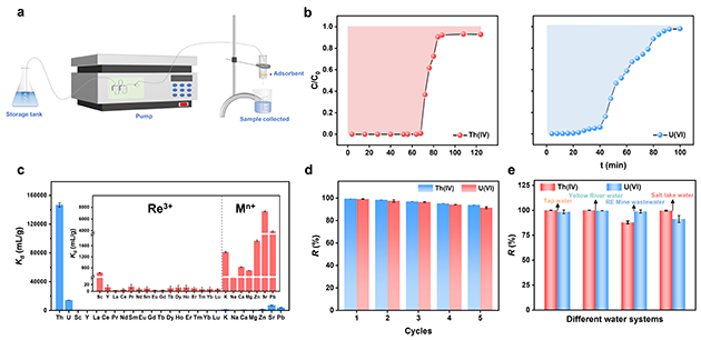 近期,研究人員進(jìn)一步通過調(diào)控羧基位點(diǎn)數(shù)量和孔腔環(huán)境,構(gòu)筑了PTA-TPPEE、BTC-TPPEE和PMA-TPPEE三種單晶材料(圖6),其中PTA-TPPEE表現(xiàn)出最優(yōu)的Th(IV)/U(VI)捕獲性能,其對(duì)Th(IV)和U(VI)的吸附可在1 min內(nèi)達(dá)到平衡,最大吸附容量分別達(dá)到582.0和325.7mg/g-1。進(jìn)一步研究表明,PTA-TPPEE兼具開放的傳質(zhì)通道和穩(wěn)定的剛性骨架,在鹽湖鹵水、稀土礦廢水等復(fù)雜水體系中對(duì)Th(IV)和U(VI)的去除率分別保持在98%和95%以上,循環(huán)使用5次后仍保持91%的去除率,表明PTA-TPPEE在從核廢水溶液中分離Th(IV)/U(VI)方面具有實(shí)際應(yīng)用潛力(圖7)。多實(shí)驗(yàn)表征結(jié)合理論計(jì)算分析進(jìn)一步揭示,羧基與目標(biāo)分析物之間的配位作用是實(shí)現(xiàn)高效吸附的關(guān)鍵,而羧基數(shù)目、骨架剛性及局部電荷環(huán)境的協(xié)同優(yōu)化則共同決定了材料對(duì)Th(IV)和U(VI)的快速傳質(zhì)、高容量捕獲與選擇性分離行為。相關(guān)研究成果發(fā)表在Science China Chemistry(DOI:10.1007/s11426-025-3032-9)上(圖8)。
