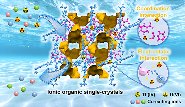 針對(duì)上述技術(shù)瓶頸,中國科學(xué)院蘭州化學(xué)物理研究所天然藥物與化學(xué)測(cè)量研究中心高效分離與資源利用課題組原創(chuàng)提出 “離子有機(jī)單晶” 新概念,該類有序晶態(tài)材料是由有機(jī)陰、陽離子配體經(jīng)離子自組裝策略綠色合成,兼具單晶結(jié)構(gòu)可精準(zhǔn)解析、孔道微環(huán)境可精細(xì)調(diào)控、功能基團(tuán)可靈活設(shè)計(jì)等獨(dú)特優(yōu)勢(shì),為復(fù)雜體系中核素的高效分離提供了全新的研究思路。目前,課題組已實(shí)現(xiàn)羧基、磺酸基、季鏻(銨)、膦酸基系列離子有機(jī)單晶的可控構(gòu)筑,并在鈾(U (VI))、釷(Th (IV))、碘等典型核素的高效分離方面取得系列創(chuàng)新性研究進(jìn)展。