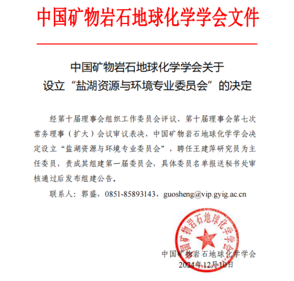 青海鹽湖所牽頭申報鹽湖資源與環(huán)境專業(yè)委員會獲中國礦物巖石地球化學學會批準設立