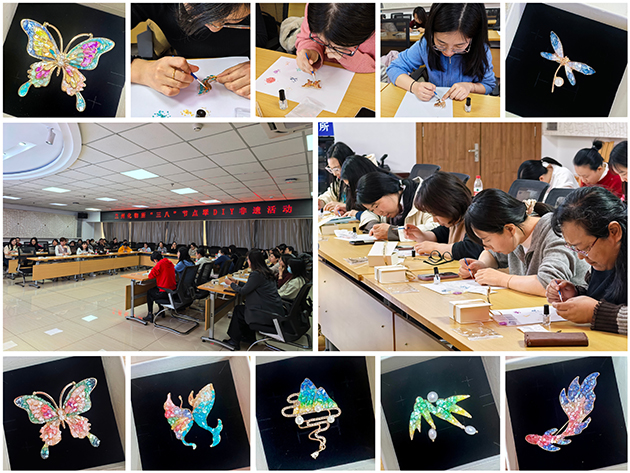 3月13日下午,組織開(kāi)展了“指尖傳非遺”點(diǎn)翠DIY活動(dòng)。培訓(xùn)老師向大家介紹了中國(guó)點(diǎn)翠工藝非物質(zhì)文化遺產(chǎn)的歷史底蘊(yùn)和文化價(jià)值,詳細(xì)講解了點(diǎn)翠胸針的制作過(guò)程。涂抹亮油、貼貝殼碎片、表面封層、定型……一片片細(xì)小的螺鈿片鑲嵌在胚底,斑斕色彩流動(dòng)交融,鮮活生動(dòng)。活動(dòng)帶大家品味了傳統(tǒng)工藝的浪漫、領(lǐng)略了沉淀千年的藝術(shù)瑰寶。