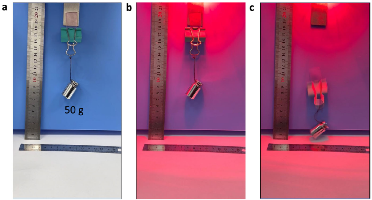 3. 響應(yīng)速度:光照觸發(fā)脫黏在幾秒內(nèi)即可完成,真正實現(xiàn)了用之即黏,取之即脫。正如下圖中所示,研究團(tuán)隊演示了該材料在不銹鋼基板上的光熱響應(yīng)行為,初始狀態(tài)下可穩(wěn)定懸掛50g重物,近紅外光照后因黏附性能切換而黏附失效。