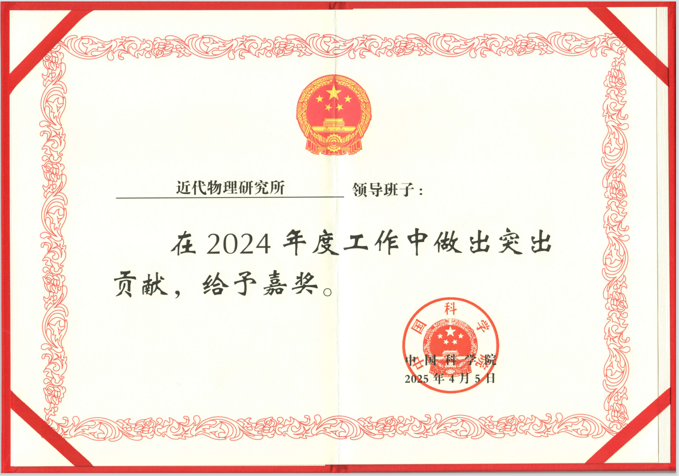 近代物理所領導班子榮獲中國科學院嘉獎