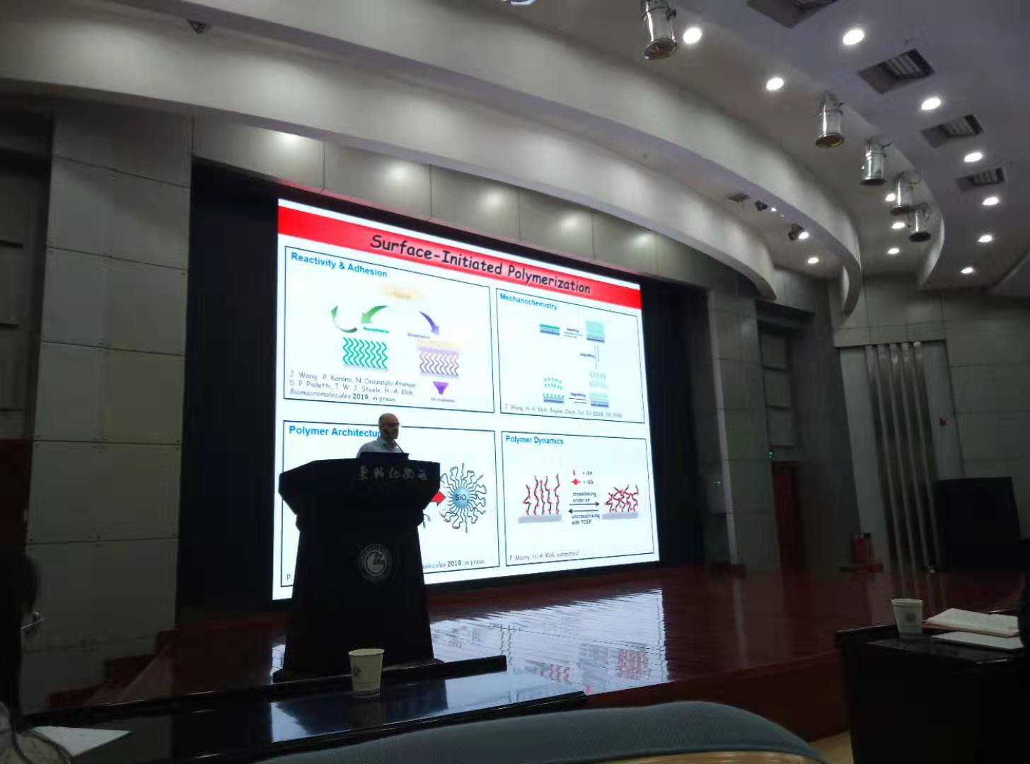 Harm-Anton Klok教授以表面引發(fā)聚合物刷接枝為切入點,重點介紹了UV輔助的組織黏附、溶脹引發(fā)的聚合物刷去接枝、納米球表面修飾以及聚合物刷動態(tài)交聯(lián)/去交聯(lián)等方面研究工作。報告結(jié)束后,Klok教授與大家就相關(guān)問題展開了討論參觀了固體潤滑國家重點實驗室,并聽取了實驗室部分老師近期工作介紹。