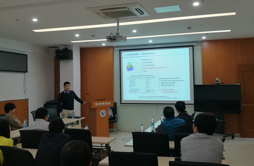 報(bào)告中,王恒博士闡述了平面超分子領(lǐng)域的研究進(jìn)展,詳細(xì)介紹了三種不同代數(shù)(G2-G4)二維平面超分子配體的模塊化合成策略及其自組裝,展示了“配體合成與自組裝一鍋法”的簡(jiǎn)便高效合成方法?;谕S六元環(huán)的三維棱柱的構(gòu)筑過(guò)程及其自組裝的機(jī)理,可將此類平面超分子拓展至三維立體結(jié)構(gòu)。報(bào)告后,王恒博士同與會(huì)人員就巨型超分子領(lǐng)域的研究進(jìn)行了討論與交流。