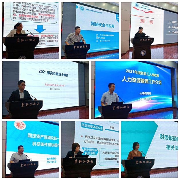 此次教育培訓(xùn)分為業(yè)務(wù)培訓(xùn)和專題培訓(xùn),業(yè)務(wù)培訓(xùn)主要由所務(wù)辦公室、黨委辦公室、科研與規(guī)劃處、人事教育處、財(cái)務(wù)處、條件保障處、公共技術(shù)中心等分別就所情所況、黨建、論文發(fā)表、人事人才、財(cái)務(wù)制度與報(bào)銷管理流程、固定資產(chǎn)管理與政府采購(gòu)、公共設(shè)施使用與行為規(guī)范、公共平臺(tái)建設(shè)與運(yùn)維等進(jìn)行了介紹。專題培訓(xùn)主要包括實(shí)驗(yàn)室安全教育、網(wǎng)絡(luò)安全與應(yīng)用、保密教育、質(zhì)量管理體系建設(shè)與運(yùn)行、館藏文獻(xiàn)與數(shù)據(jù)庫(kù)應(yīng)用等,并就質(zhì)量管理體系和安全教育培訓(xùn)組織了考試。