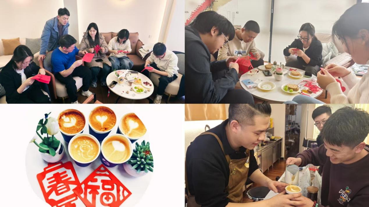 活動(dòng)現(xiàn)場(chǎng),同學(xué)們專(zhuān)注體驗(yàn)剪紙的魅力、興奮展示各自的剪紙成果?,F(xiàn)場(chǎng)洋溢著濃厚的節(jié)日氛圍,每一片窗花、每一個(gè)“福”字,每一份新年寄語(yǔ)都承載著大家對(duì)新一年的美好期盼。隨后,大家在咖啡師的現(xiàn)場(chǎng)教學(xué)下投入到咖啡拉花制作,感受咖啡制作的樂(lè)趣。