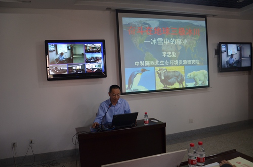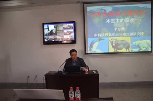 李忠勤結(jié)合自己在高寒極端環(huán)境無私奉獻30年的難忘工作經(jīng)歷,為與會人員深情講述了他《奮斗在地球三極冰川》的感人故事。他的報告分“北極科學(xué)考察介紹”、“走進南極”和“中國冰川定位觀測”三個部分,通過普及地球三極(南極、北極和青藏高原)知識、梳理回顧世界及中國冰川科考歷史、介紹中國冰川科考站情況及科考隊感人事跡,為大家作了一場生動、感人的報告,一幅幅珍貴難得的實地照片再現(xiàn)了冰川科考工作的極端艱辛,一句句深情感人的樸實語言展示了共產(chǎn)黨人無私奉獻的政治品格。同時,他強調(diào)指出,他所在的科研團隊結(jié)合冰凍圈科學(xué)研究以野外工作為基礎(chǔ),具有人員分散、工作辛苦等特點的實際,制定了以黨小組為單元,研究室支部、所黨委聯(lián)動的“兩學(xué)一做”方案,以科研工作為載體和抓手,深入扎實推進“兩學(xué)一做”學(xué)習(xí)教育,取得了良好效果,發(fā)揮了黨支部是戰(zhàn)斗堡壘作用。他的報告圖文并茂,真實感人,既是一場科普報告,更是一場生動黨課,受到與會人員歡迎和好評。